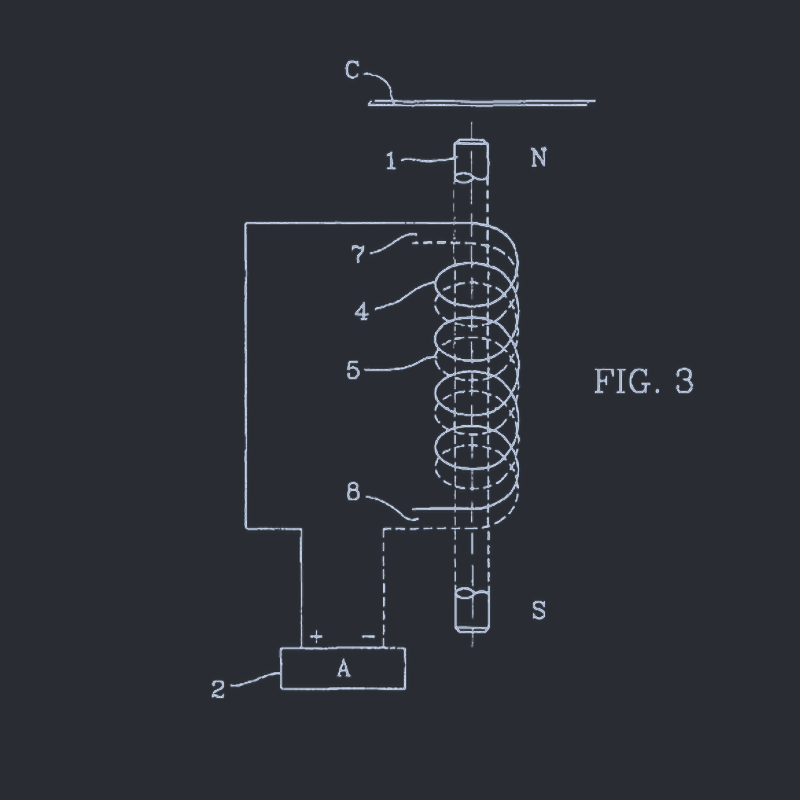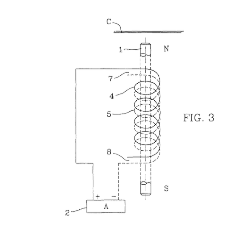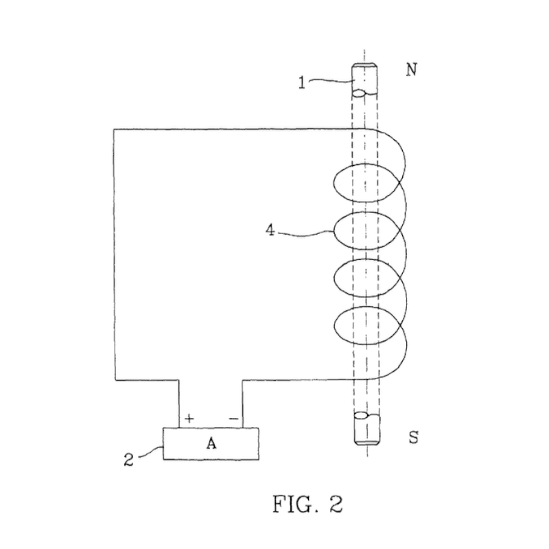 I found this patent recently and was impressed with it’s simplicity. Filed in 2001 by Giovanni Gaglio, it appears to be a magnetic pole piece with two wires wrapped around it, rather than one. How is this a novel advancement? Gaglio explains the issue his invention solves: